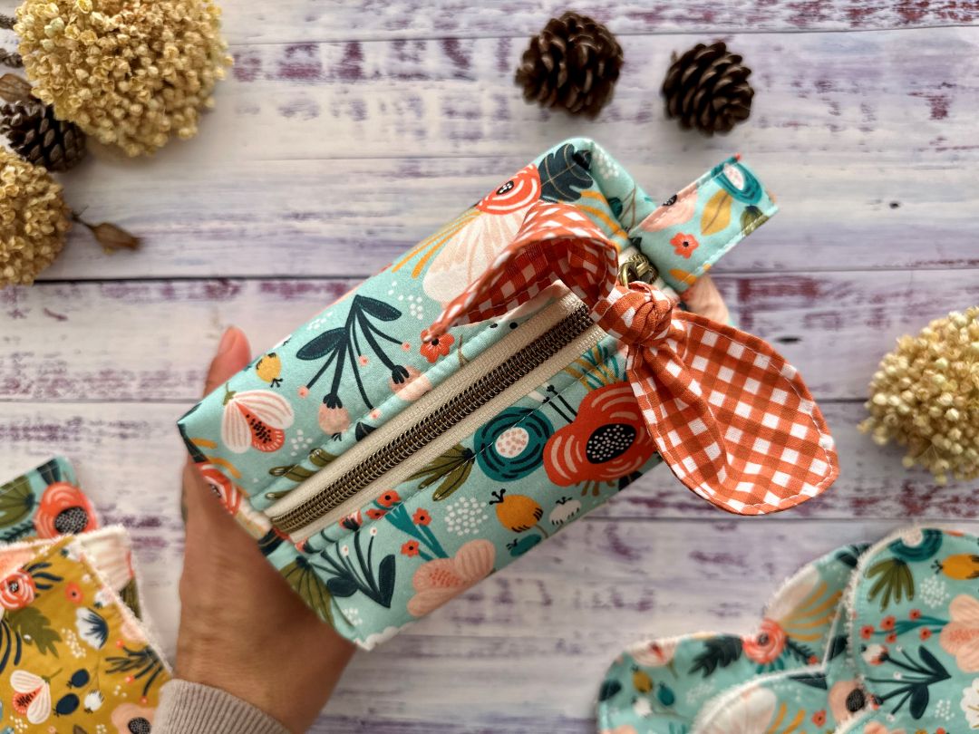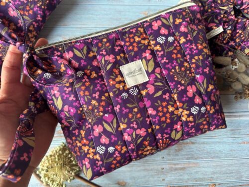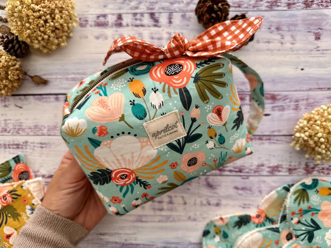 Si apre e chiude con una zip a cui è assicurato un fiocco decorativo e ha una pratica maniglia in cotone per essere trasportato e volendo, appeso.