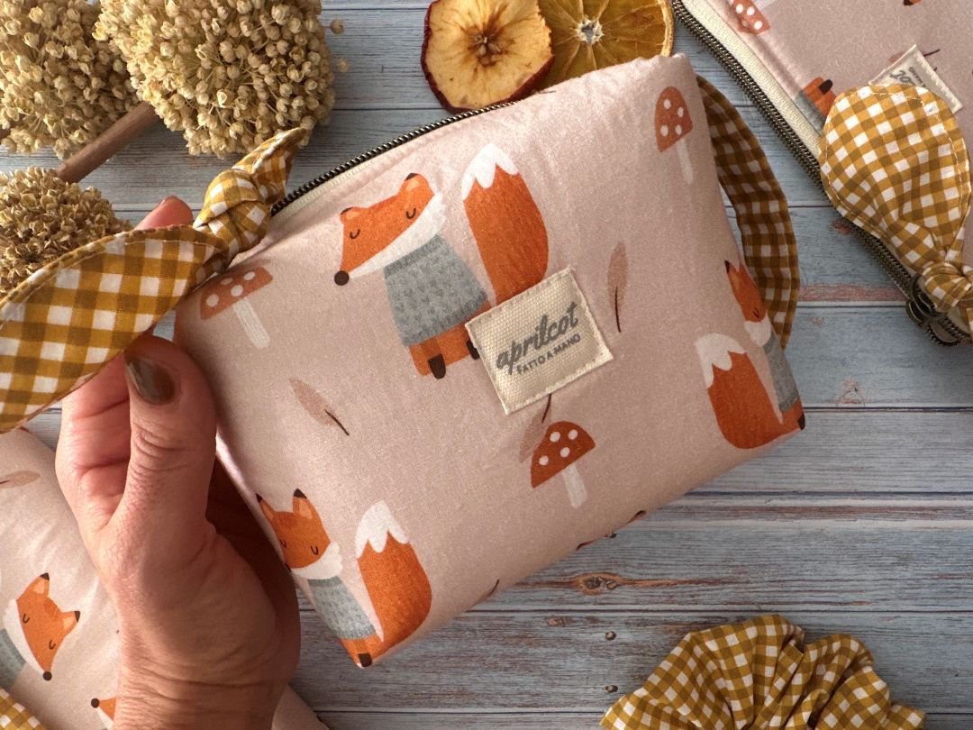 Si apre e chiude con una zip a cui è assicurato un fiocco decorativo e ha una pratica maniglia in cotone per essere trasportato e volendo, appeso.