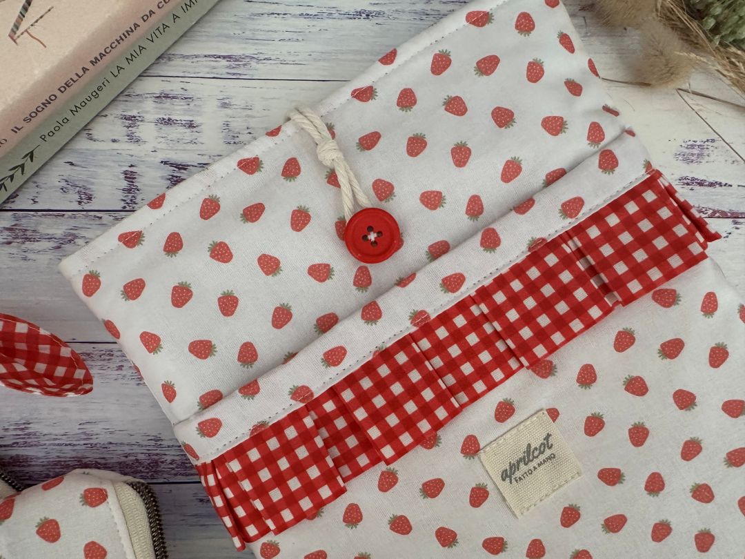 La tasca frontale è decorata con un volant di pizzo in cotone, nel tessuto della cover libro.